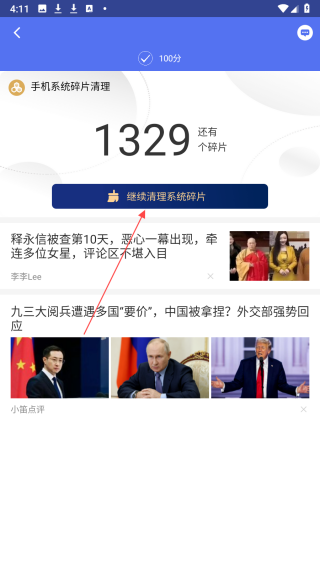2、检测完成后会显示手机系统碎片清理界面,若检测到碎片,点击继续清理系统碎片进入详细的碎片清理界面。