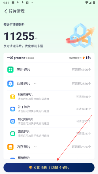 3、在碎片清理界面能看到应用碎片、系统碎片等不同类型的碎片及预计可清理数量,确认后点击“立即清理”按钮,即可清理检测出的垃圾碎片,优化手机性能。