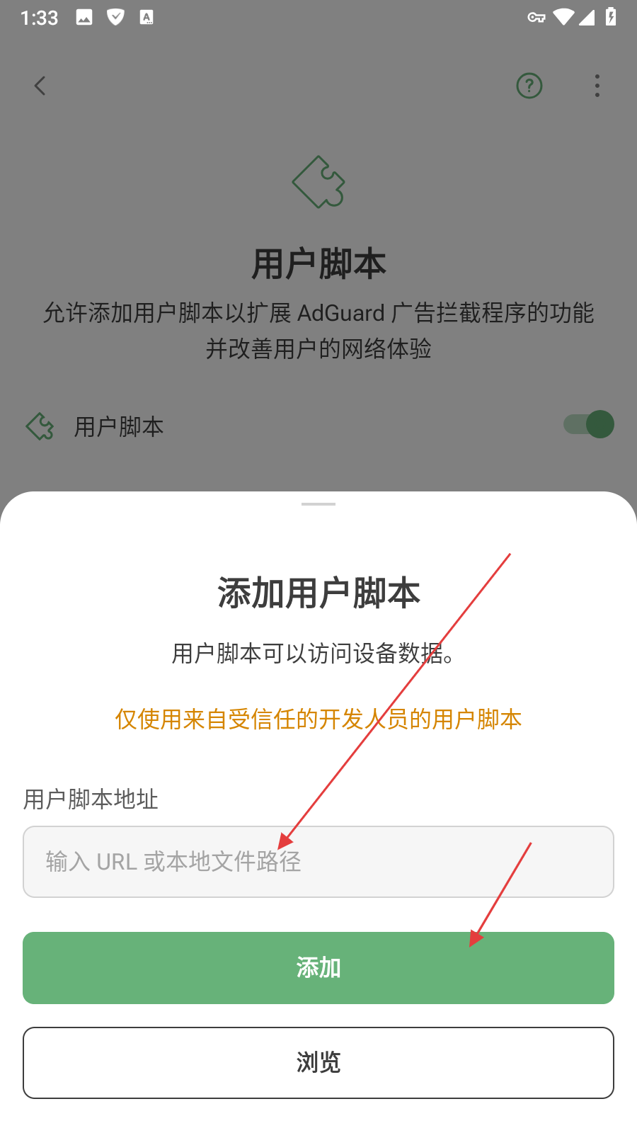 4、在用户脚本地址输入框中输入脚本的URL或本地文件路径,输入完成后点击添加按钮,即可完成用户脚本的添加。