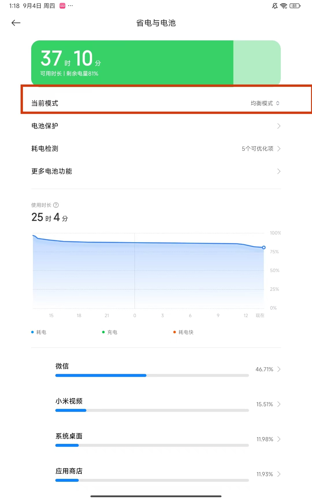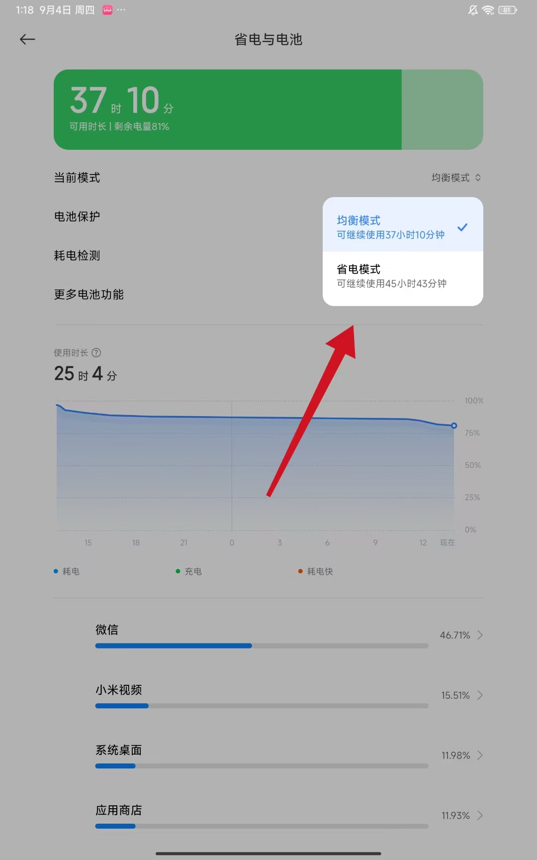2、进入省电与电池页面后,找到并点击当前模式选项,查看当前电池模式。