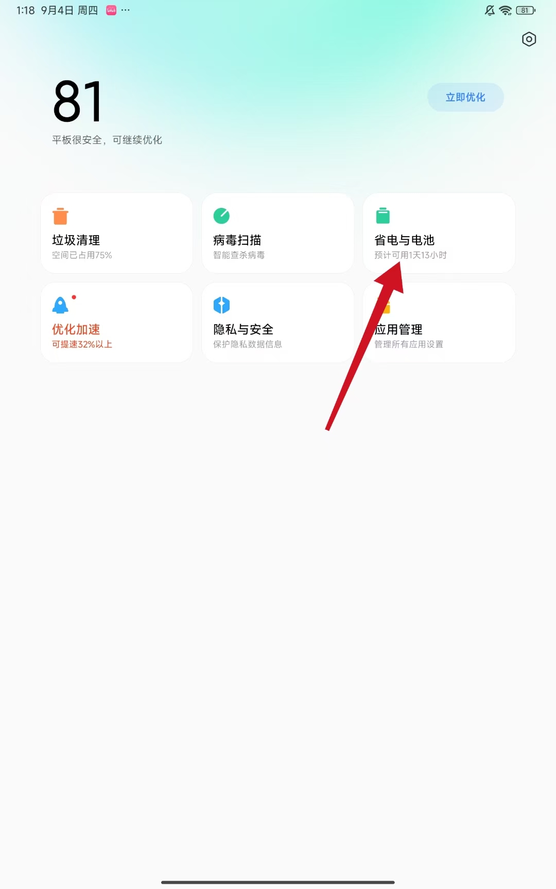 1、打开小米手机的手机管家应用,点击主界面中的省电与电池选项。