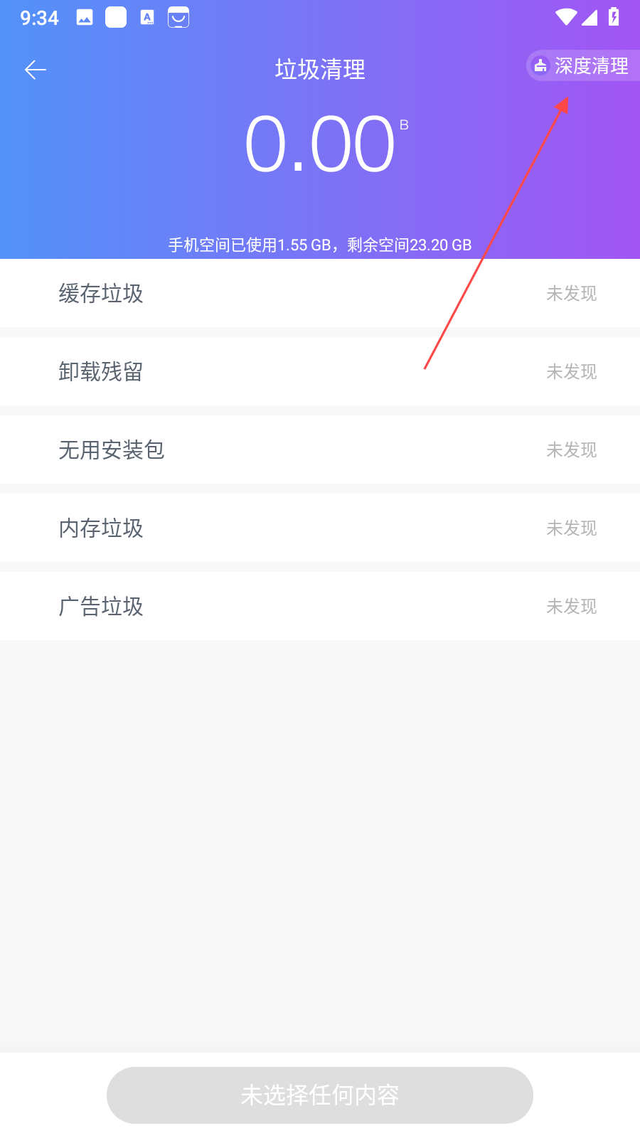 2、进入垃圾清理界面后,能看到缓存垃圾、卸载残留等信息显示,点击界面右上角的深度清理选项,程序便会开始扫描手机中可深度清理的数据,如图片、视频、应用数据等。