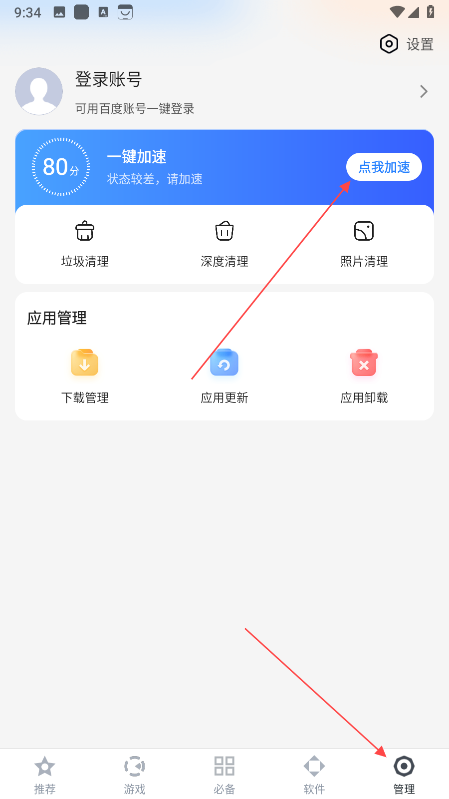 1、打开百度手机助手,点击底部导航栏中的管理选项,进入管理界面,在管理界面中,点击点我加速对手机进行初步加速,之后找到垃圾清理选项并点击进入。