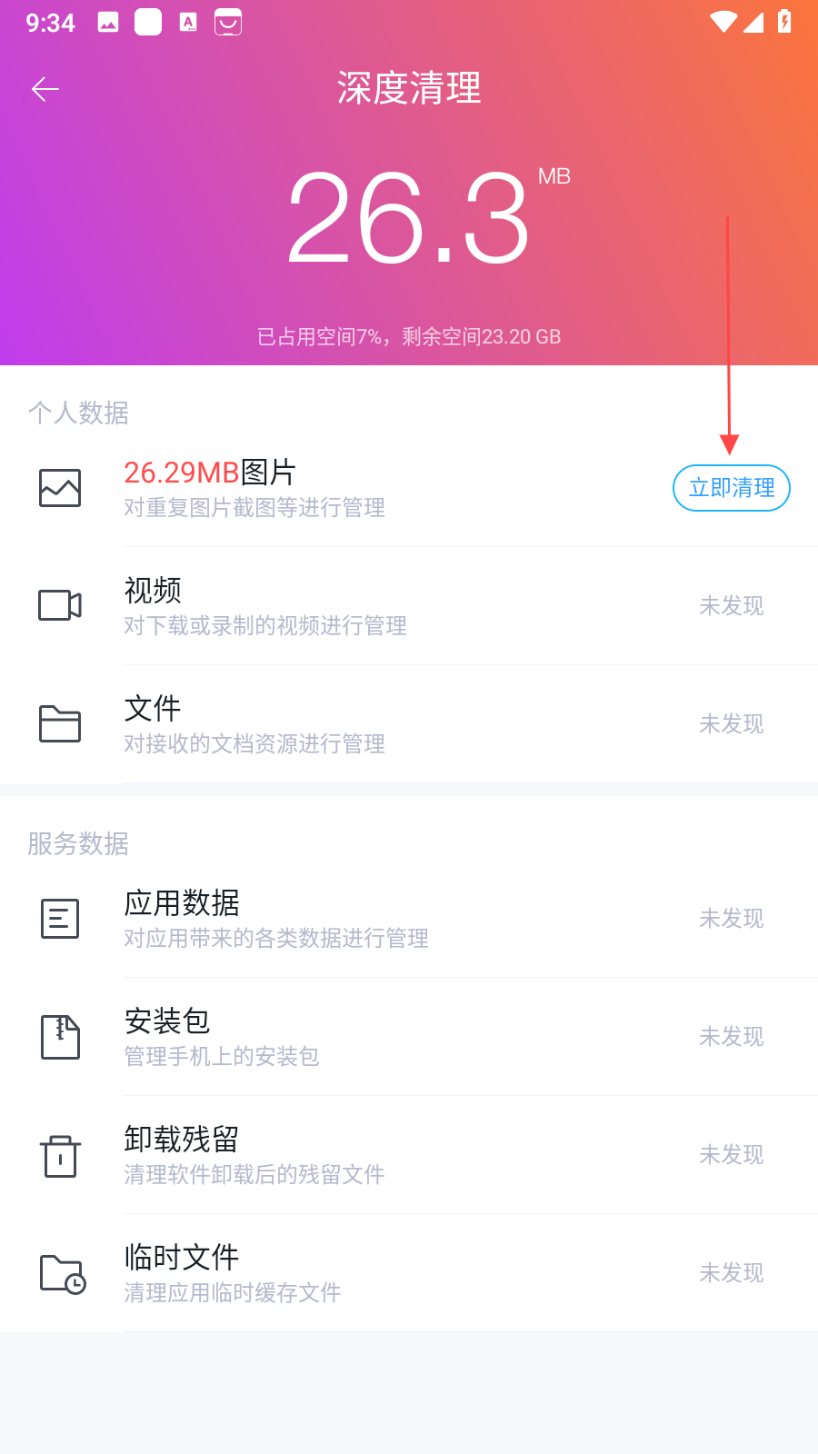 3、深度扫描完成后,会显示可清理的数据类别及占用空间大小,点击对应类别右侧的立即清理按钮,就能清理相应的垃圾数据,释放手机存储空间。