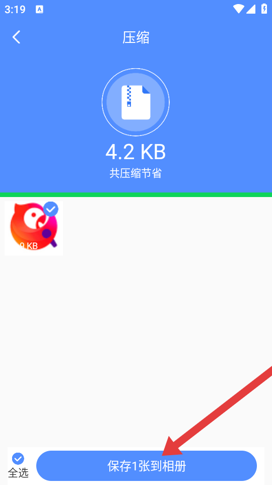3、勾选完成后,点击底部的压缩1张按钮,进入压缩进度页面,压缩完成后,点击保存1张到相册按钮。