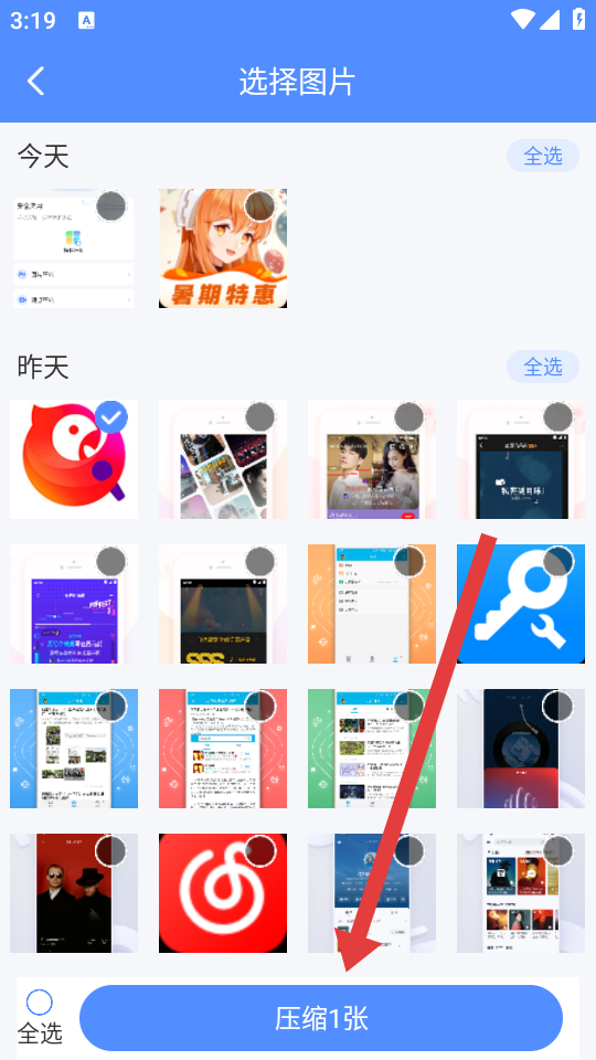 2、在选择图片的页面中,勾选需要压缩的图片如昨天栏目下的红色图标图片。