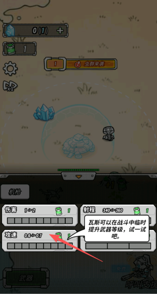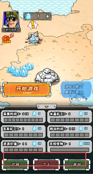 4、后面可以在下方选择武器,或者是工人以及基地的升级,提示属性。