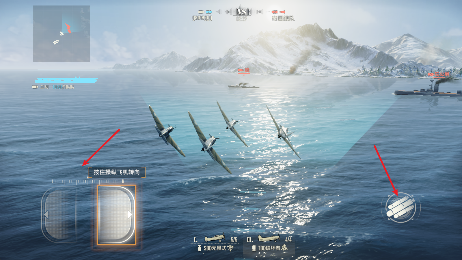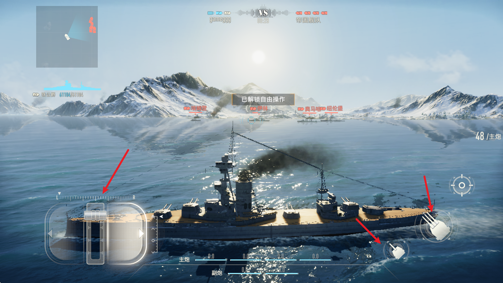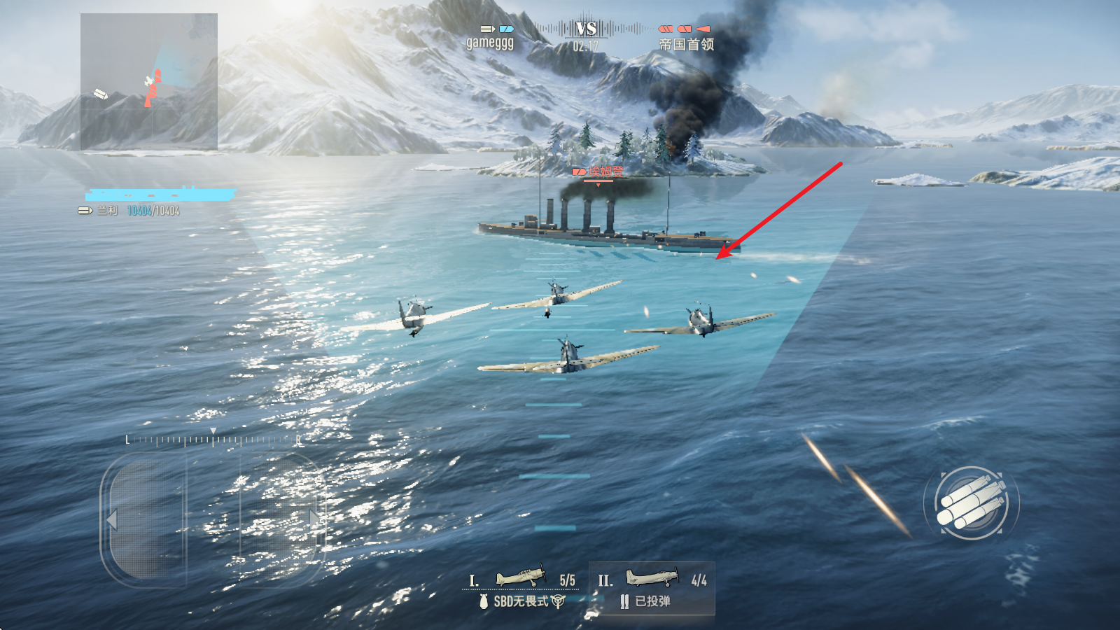 5、随后我们就可以操控战舰进行攻击了,和飞机一样左边控制移动,右侧则是主炮和副炮射击。