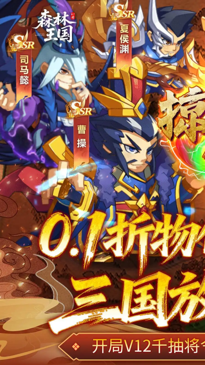 Q萌三国挂机卡牌《森林王国(0.1折V12神魔三国)》全新版本正式来袭,登录即送特权V12,解锁超多功能。上线再领千抽名将令、千抽神魔令,抽卡嗨不停集齐三国名将,爽玩三国战场。首充解锁五虎上将关羽,佛挡杀佛神挡杀神。放置挂机,护肝养肾,主公快来三国世界厮杀!