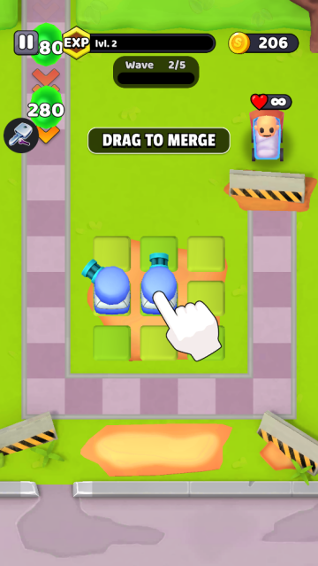 -当你将两个相同等级的炮塔合并后,将会获得功能更强大的单位,这样一来,面对涌来的史莱姆,你将拥有更强的火力。