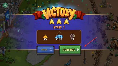 4、完成第一关卡后点击继续按钮领取通关奖励,包括金币与资源,用于后续升级并进入下一阶段挑战。