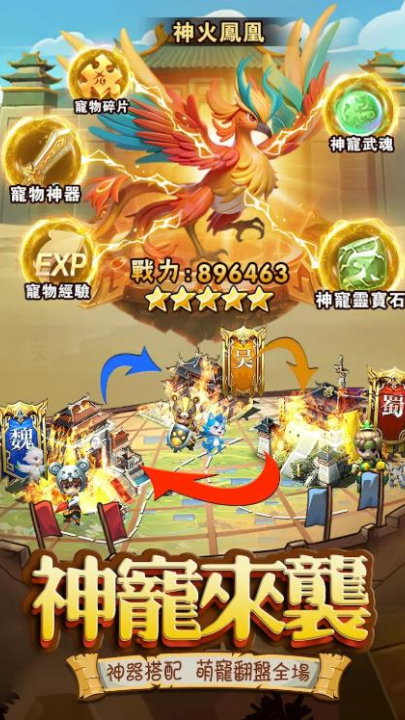 2、通过培养神兵、强化装备、镶嵌兵符等方式提升整体战力,打造属于你的无敌部队。