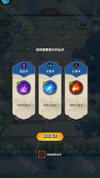 2、等上面的能量满了之后会出现三个法术让你选一个,也可以刷新重选以此类推。