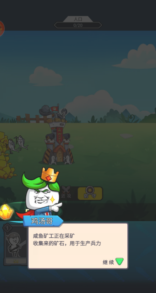 1、进入游戏后,你要根据指示去召集咸鱼矿工采矿,收集大量的矿石去生产兵力。