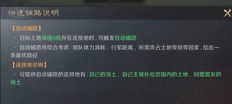 3.自动铺路:目标地块周围9格存在链接地时,可触发自动铺路;自动铺路将综合考虑:部队体力消耗、行军距离、所需攻占地块等级等因素给出一条最优路径