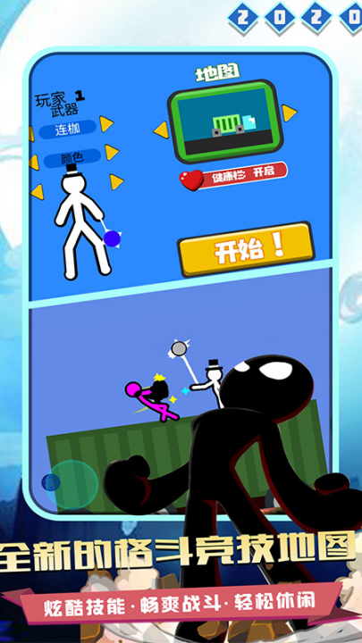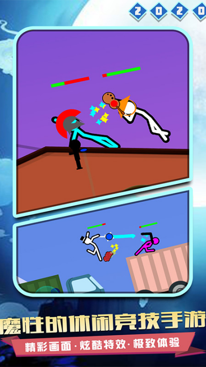 火柴人对决2020无广告版是一款休闲竞技类游戏,玩家进入游戏选择一个火柴人即可参与对战,只需要操控火柴人进行动作击败敌人即可。该游戏中玩家可以给自己的火柴人随意选择武器来进行对战,还有生动热血的音乐,需要做到的就是击败敌人。内设超多地图随机切换,玩家不仅可以靠自己的操作,还可以用策略以及地形的优势,请顺利的击败敌人,成功活下去吧!