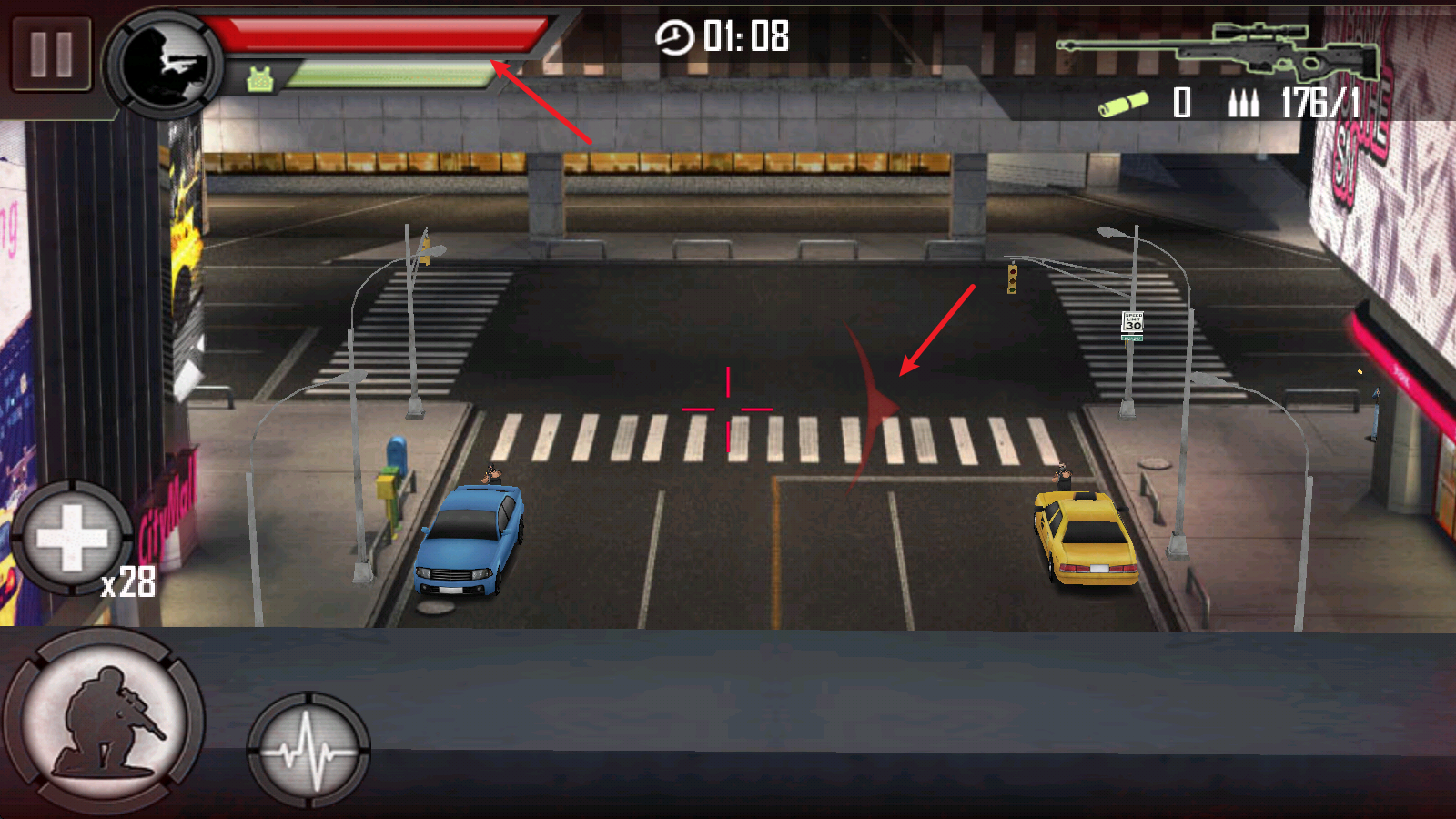 3、我们开枪之后就会暴露位置,被敌人攻击,根据红色箭头也能了解到敌人的位置。