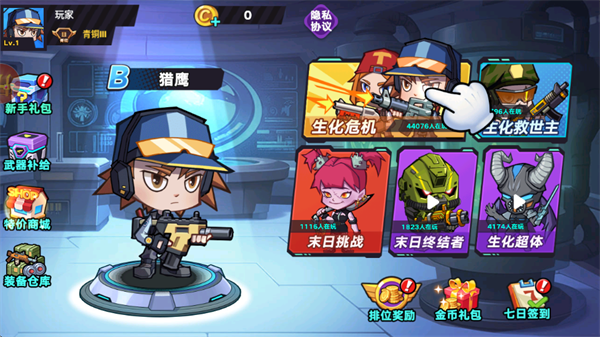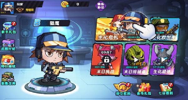 1、进入游戏后,你可以看到卡通人物拿起武器作战的画面。