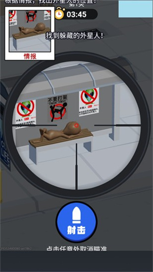 3D写实场景搭配趣味找茬射击,外星人隐藏在日常环境中还会移动隐身,游戏的代入感超强烈,单人模式下考验玩家们的眼力和手速,操作简单易上手,创意十足,融合了找茬和射击玩法,让游戏更加有趣。