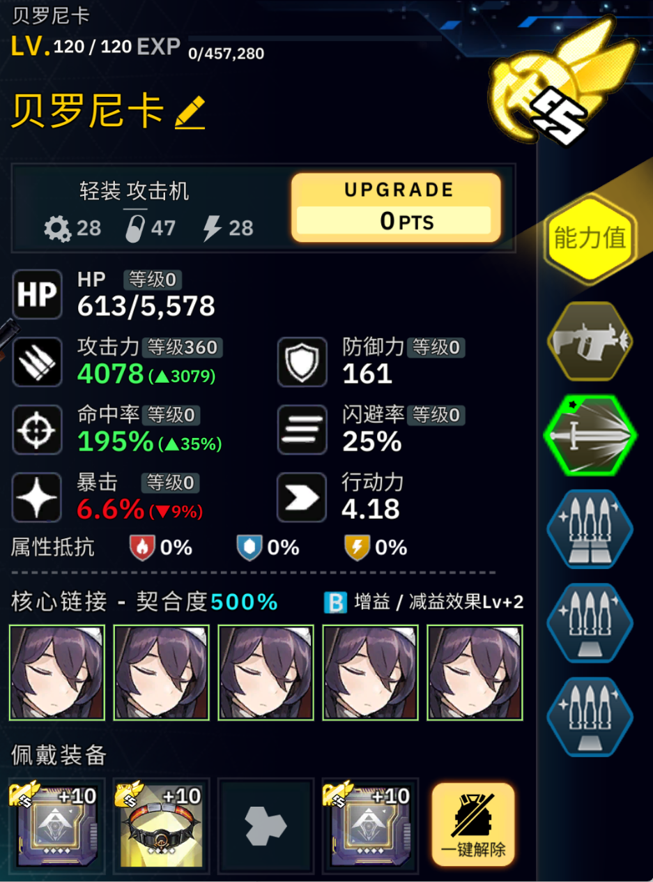 芯片都是打战术训练增送的,实际开荒我没调整命中,打到5-8除了粉毛满暴全攻击力,剩下四人30级。期间遇到高闪避怪物都是手动用t位引导粉毛狙点名秒杀,海星经常miss,红莲自律不会开全体buff,遇到高闪避怪物可以手动开一下,能加很多命中率。最后备战5-8boss重新洗点凹了下暴击,很轻松一回合秒杀。