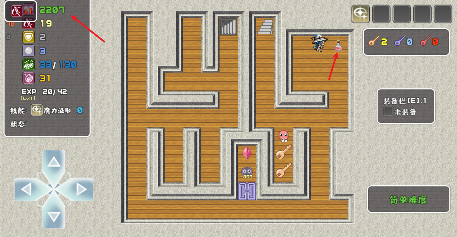 2、左侧可以看到自己的属性,拾取不同颜色的宝石可以提升对应属性,红色宝石增加攻击,蓝色宝石增加防御,绿色宝石可以MP和魔防值。
