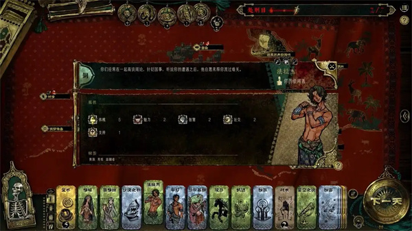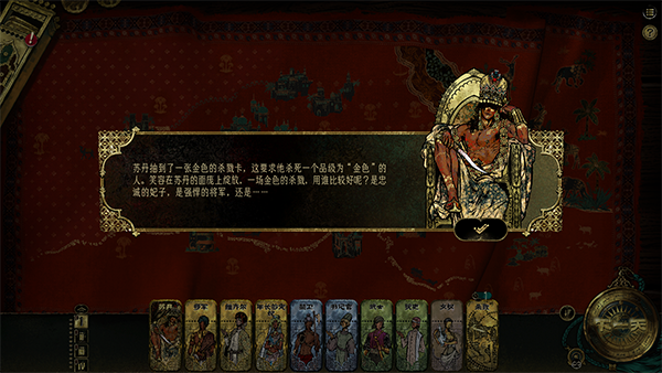 每轮随机抽取苏丹卡,通过分配盟友、资源与行动指令完成任务。纵欲卡需满足肉体欲望,奢靡卡要求挥霍财富,征服卡触发冒险挑战,杀戮卡则需献祭生命。任务完成度影响角色属性与道德值,过度放纵将导致盟友背叛或苏丹猜忌。