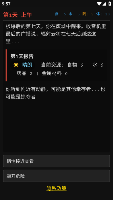 最后七日游戏最新版下载是一款好玩的文字模拟生存游戏。玩家从避难所醒来后只有七天的事件来应对辐射云的到来,所以玩家需要时刻保持清醒,做出让自己能够活更久的选择,而且游戏中每天都有不同的事件和天气变化,会营造出一种强烈的紧迫感,促使玩家合理的规划时间和行动,