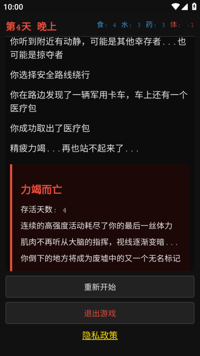 资源管理:食物、水、药品、体力……任何一项耗尽都会导致死亡
