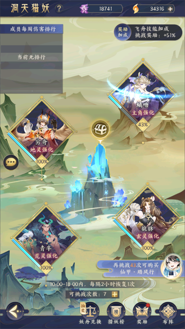 此外洞天猎妖的挑战次数也是每日刷新的,建议在12:00-14:00或18:00-20:00的奖励加成时间内进行挑战。