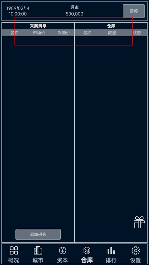 采购清单——详细显示所采购的物品市场价以及采购价,采购价越高,采购速度越快,注意定好采购价格,不要让自己销售收入还没有采购支出的多。