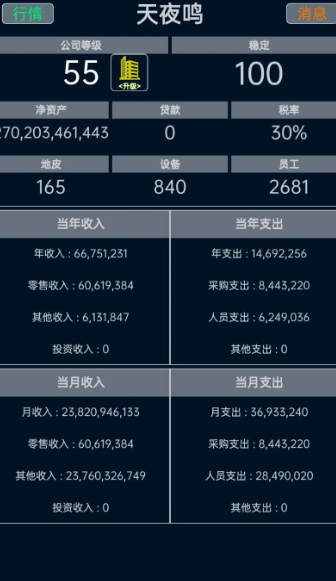 贷款——初始1级公司可以贷款50万,升级公司解锁下一个贷款权限,例,4级公司可以贷款500万,贷款金额分期付款,每月月初扣款。