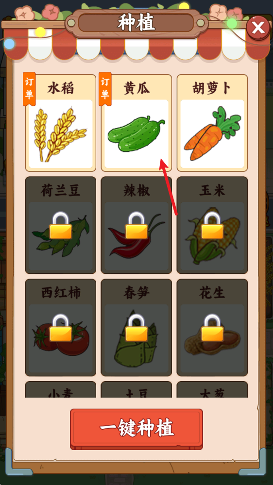 2、打开种植界面后,我们选择带有订单标识的作物种植即可,也可以点击一键种植。