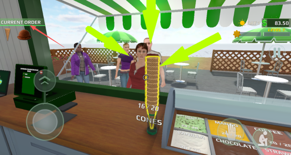 2、当顾客靠近柜台时点击电脑图标,根据顾客头顶气泡提示选择对应口味的冰淇淋订单。