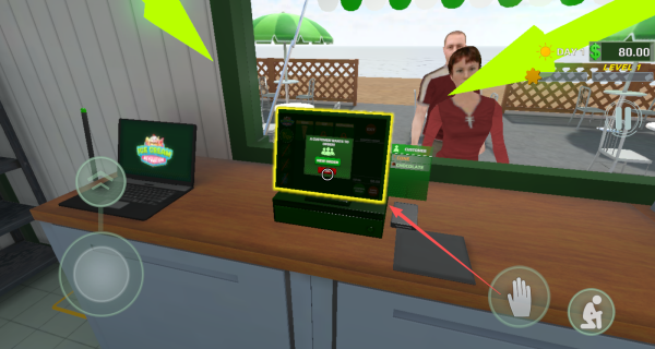 1、使用左侧虚拟摇杆控制角色在店内移动,右侧互动键可与操作台、收银机等设备交互。