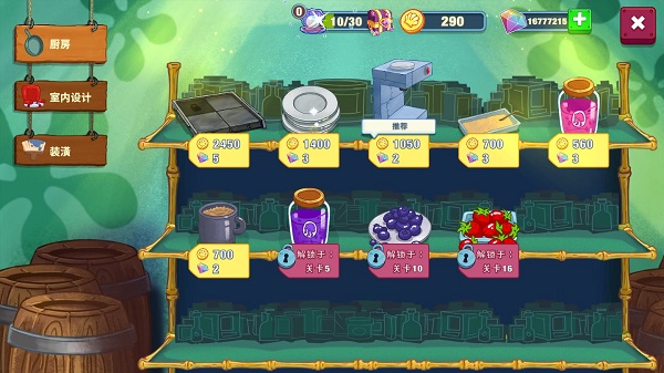 5、为了能够吸引更多的海底顾客,店内的装饰以及室内的装修设计都是提升餐厅知名度的实际效果,所以这里提供了丰富的选择性来让玩家自由定制专属您的店铺风格!