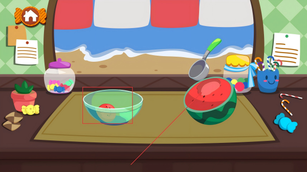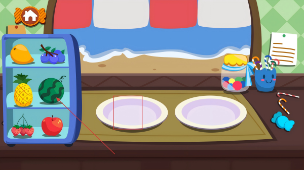 2、来到食材区,选对应水果,拖至空盘,为制作食物备料。