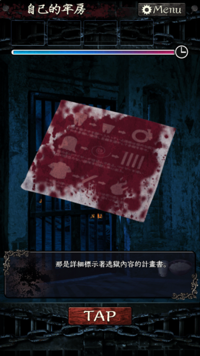 移动,调查铁门,出牢房,在通道用火烧领子,获得“字条”。