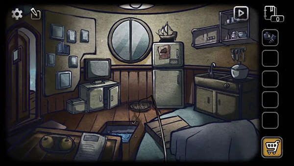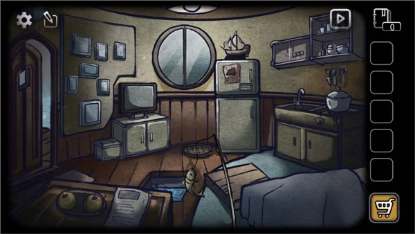 回到房间,选择潜水设备,点击地板中间的洞(之前获得鱼的地方)过关。