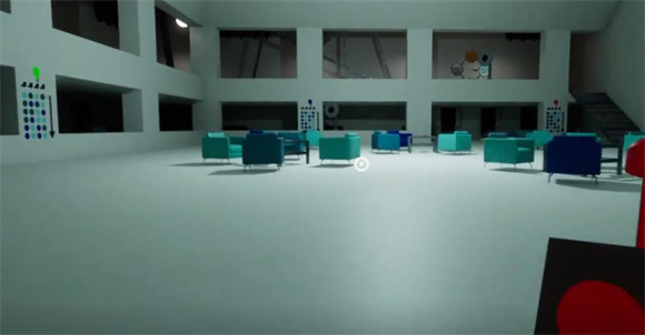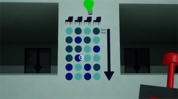 3、玩家需要按照顺序点亮桌子上的灯泡,桌子周围有不同颜色的椅子,对着墙壁上面的颜色来点亮就可以