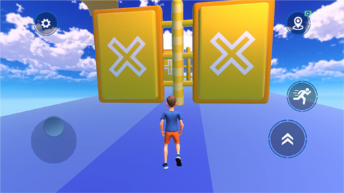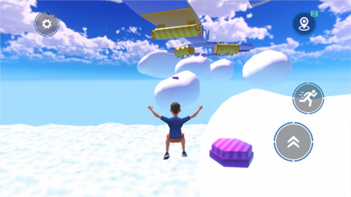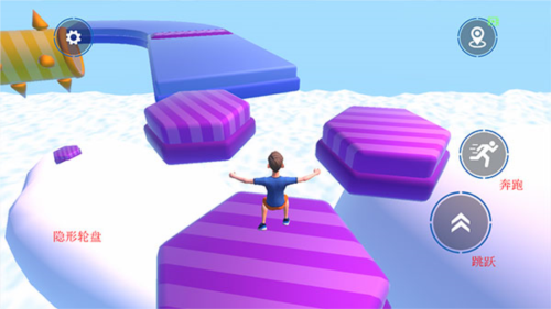 2、然后熟悉一下操作:右侧有“奔跑”、“跳跃”按钮,左下角滑动隐形轮盘,控制角色移动。
