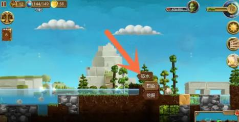 3.打造好桶以后,找到地图上的水池,点击水,再点击【取水】,等待矮人过来取水即可。
