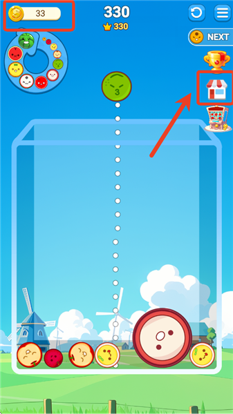 4、合成的水果越大,获得的金币就越多,金币可以用来兑换背景图片。