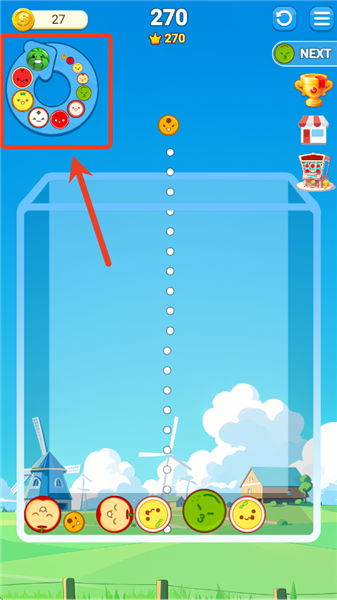 3、准备降落的水果是随机出现的,玩家可以查看左上角合成路径选择合适降落点。