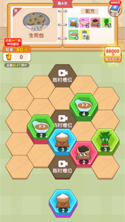 3、一旦所有的槽位都放满了,那么就会闯关失败,玩家可以看视频解锁更多的槽位。
