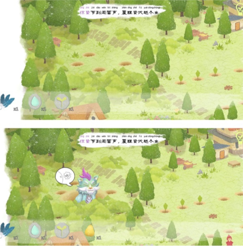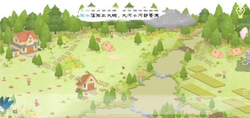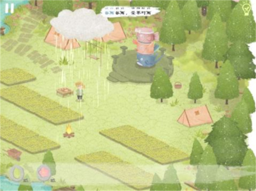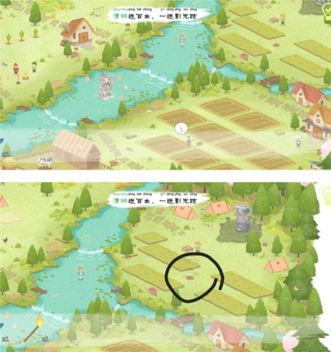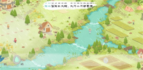 当全部河流都被灌满后,河边的老婆婆兴奋地跳进了河里,点击婆婆旁边可获得“水滴石板”,大雨下,田地上方也可获得嫩芽石板。