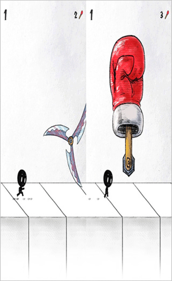 第二个机关随机出现拳套或者旋转不停的刀片;首先介绍一下刀片,由于火柴人跑的快,而刀片转速慢,所以不加调整就过不去了。通过的方法是火柴人跑到刀片下方后快速点击两下手机屏幕,稍微一减速,过去正好。