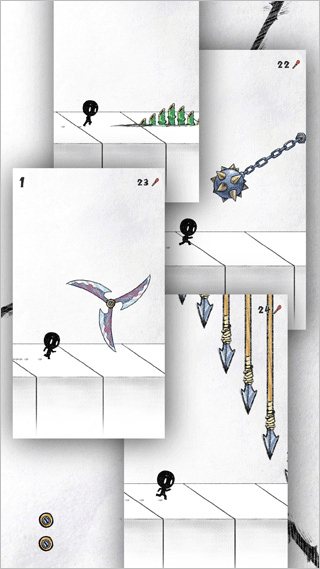 游戏玩法很简单,点击屏幕来控制火柴人往前跑或者往后跑,通过这种方式来避开机关尽可能地冲到更远的地方,每冲过一个机关就能获得一分,游戏中有大量不同的机关等着你来挑战……