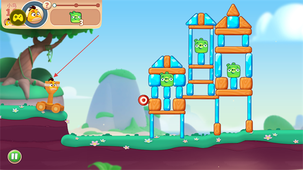 2、进入游戏场景后,观察绿色小猪所在的建筑结构,拉动小鸟,调整发射角度和力度,目标是消灭所有小猪。