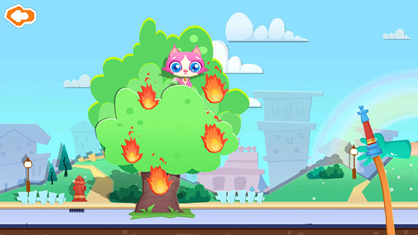 5、不好,原来是着火了,还有只小猫被困在了树上。小伙伴,快给消防员糖糖搭把手,拖动右边的水管,对准火团。耶!大火熄灭了!