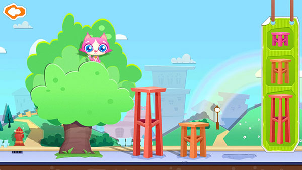 6、不过,小猫受到了惊吓,不敢从树上下来。别着急,将右边的凳子从高到低拖到指定位置,为它搭一个梯子!太棒了,猫咪安全地跳了下来。